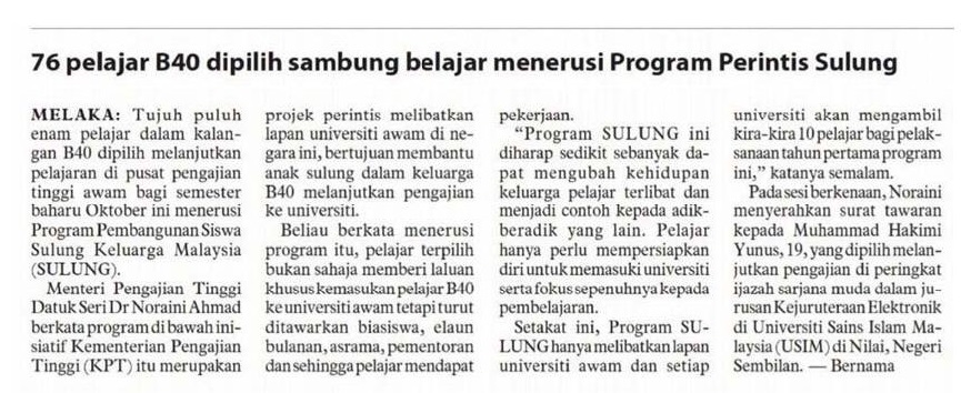 76 pelajar B40 dipilih sambung belajar menerusi Program Perintis Sulung