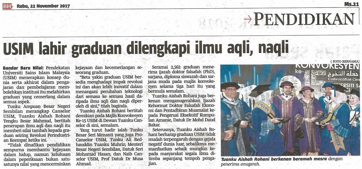 BERITA HARIAN - USIM LAHIR GRADUAN DILENGKAPI ILMU AQLI, NAQLI, 22 NOVEMBER 2017, MS 21.jpg