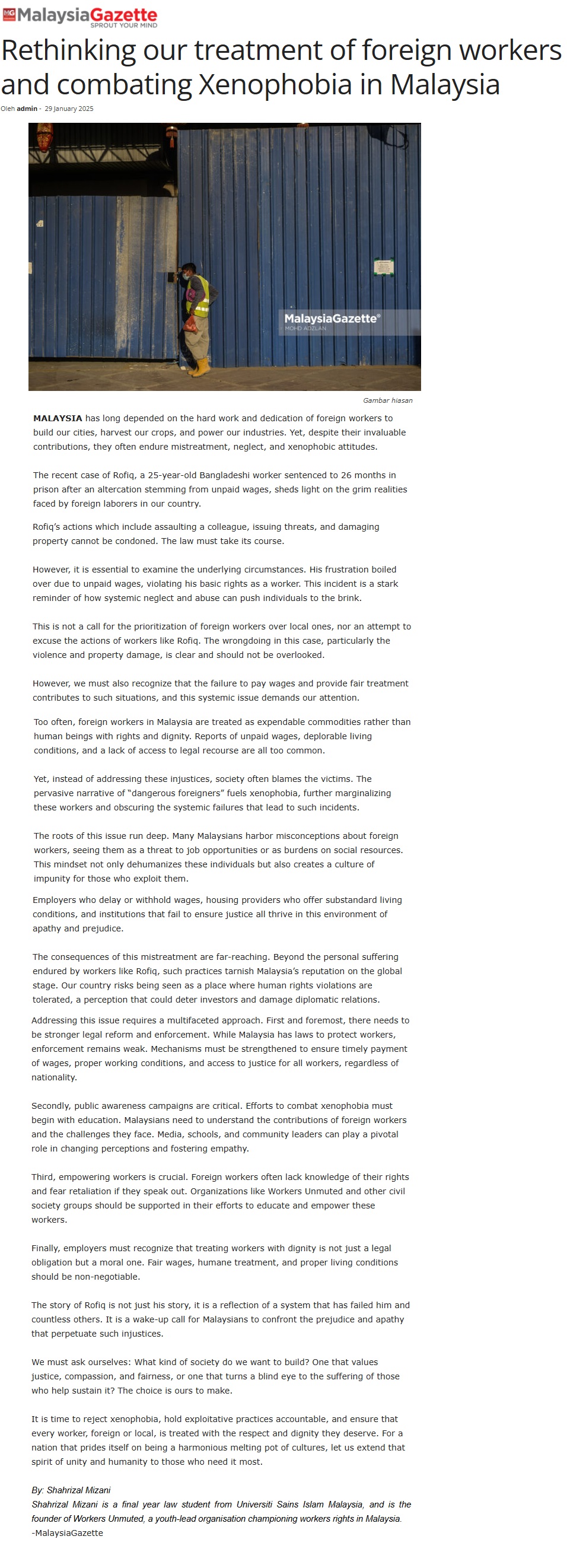 RETHINKING OUR TREATMENT OF FOREIGN WORKERS AND COMBATING XENOPHOBIA IN MALAYSIA