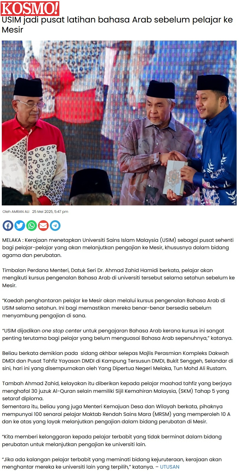 KOSMO ONLINE 25 MEI 2025 USIM JADI PUSAT LATIHAN BAHASA ARAB SEBELUM PELAJAR KE MESIR.jpg