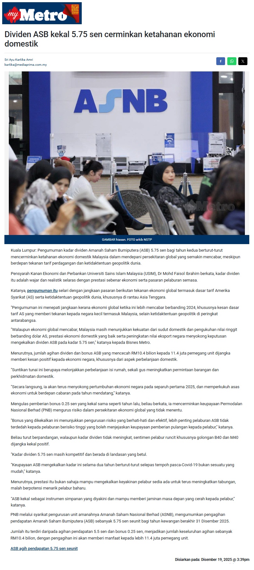 DIVIDEN ASB KEKAL 5.75 SEN CERMINKAN KETAHANAN EKONOMI DOMESTIK
