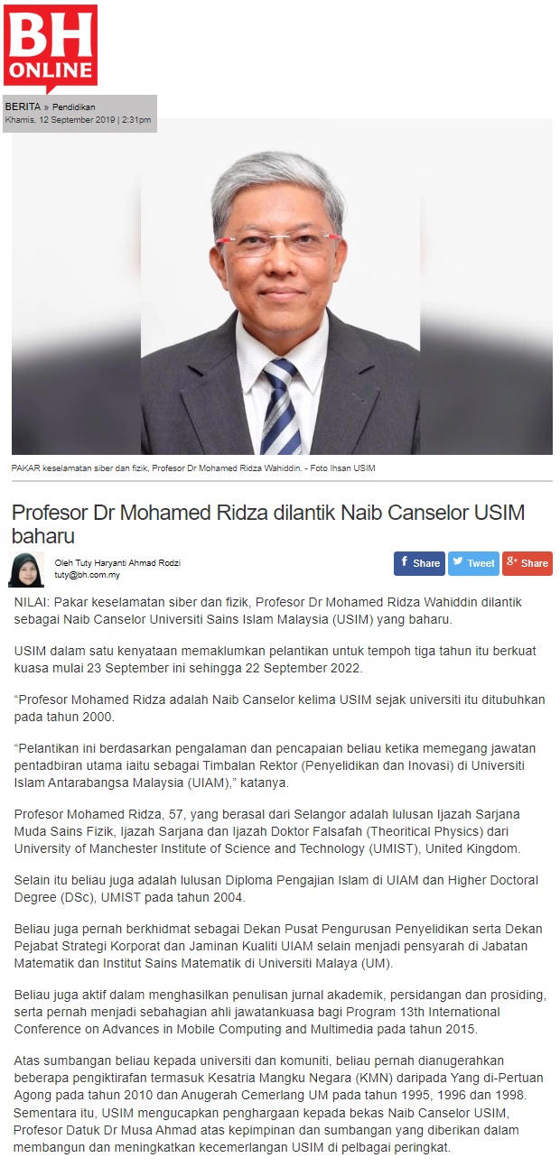 Prof Dr Mohamed Ridza Dilantik Naib Canselor USIM Baharu