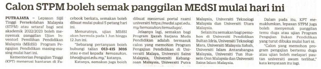Calon STPM Boleh Semak Panggilan Medsi Mulai Hari Ini