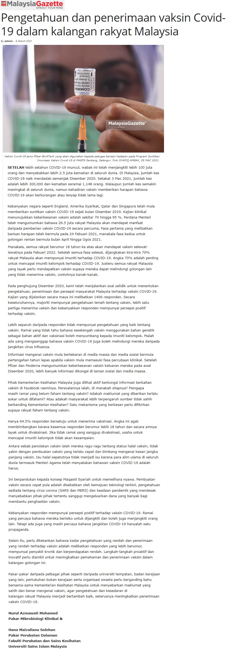 Pengetahuan Dan Penerimaan Vaksin Covid-19 Dalam Kalangan Rakyat Malaysia