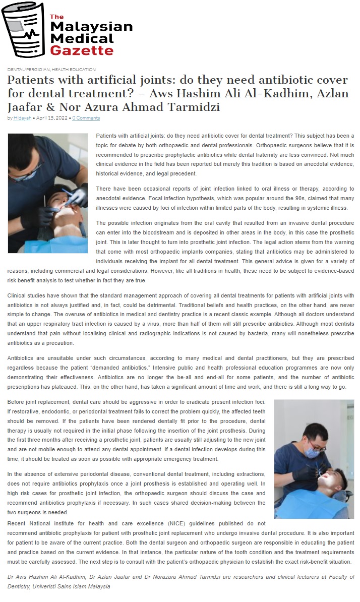 Patients With Artificial Joints; Do They Need Antibiotic Cover For Dental Treatment