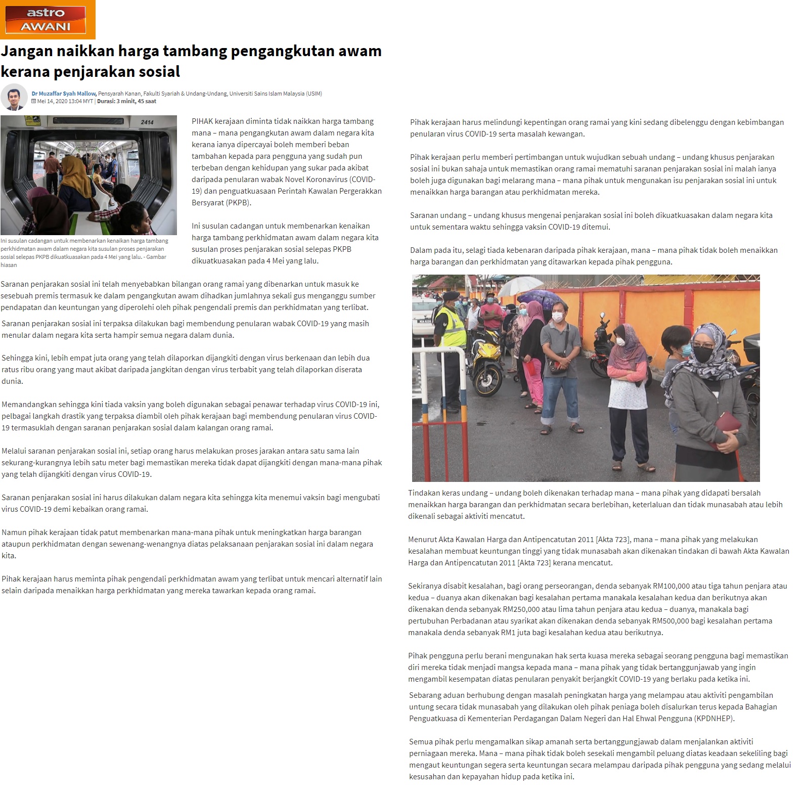 Jangan Naikkan Harga Tambang Pengangkutan Awam Kerana Penjarakan Sosial