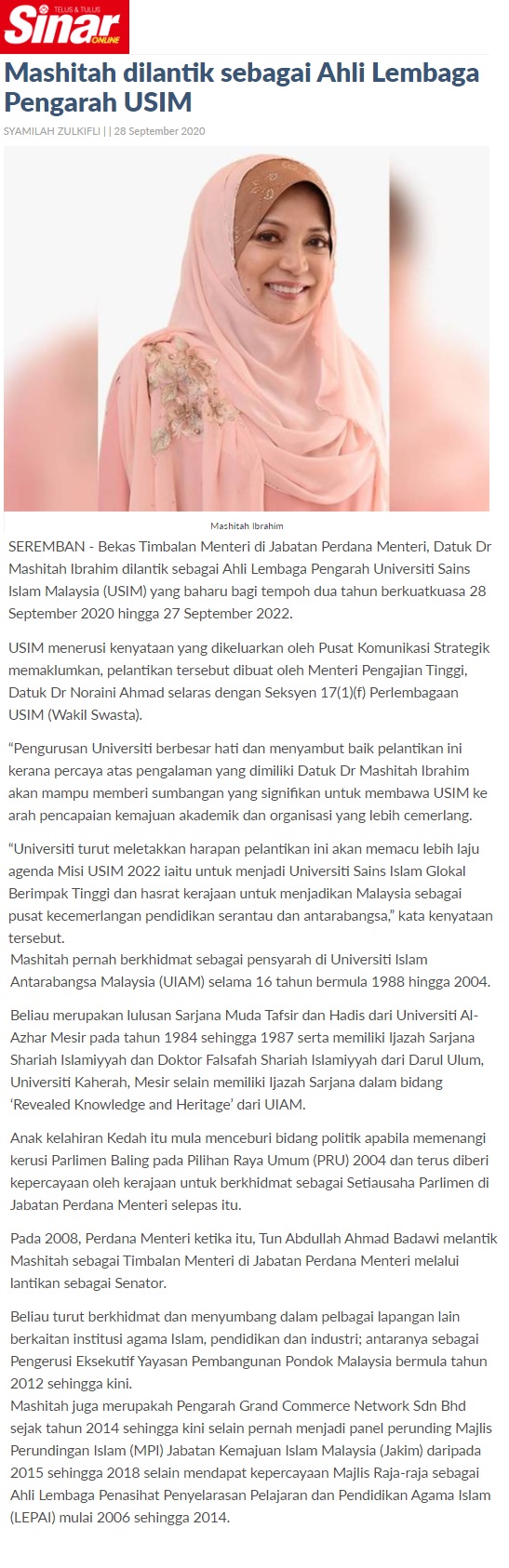 Mashitah Dilantik Sebagai Ahli Lembaga Pengarah USIM