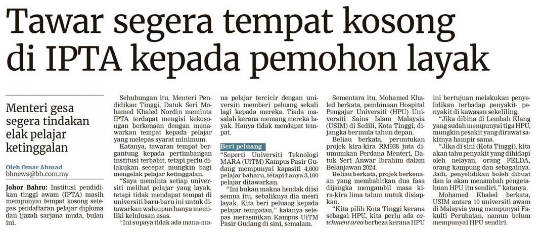 Tawar segera tempat kosong di IPTA kepada pemohon layak