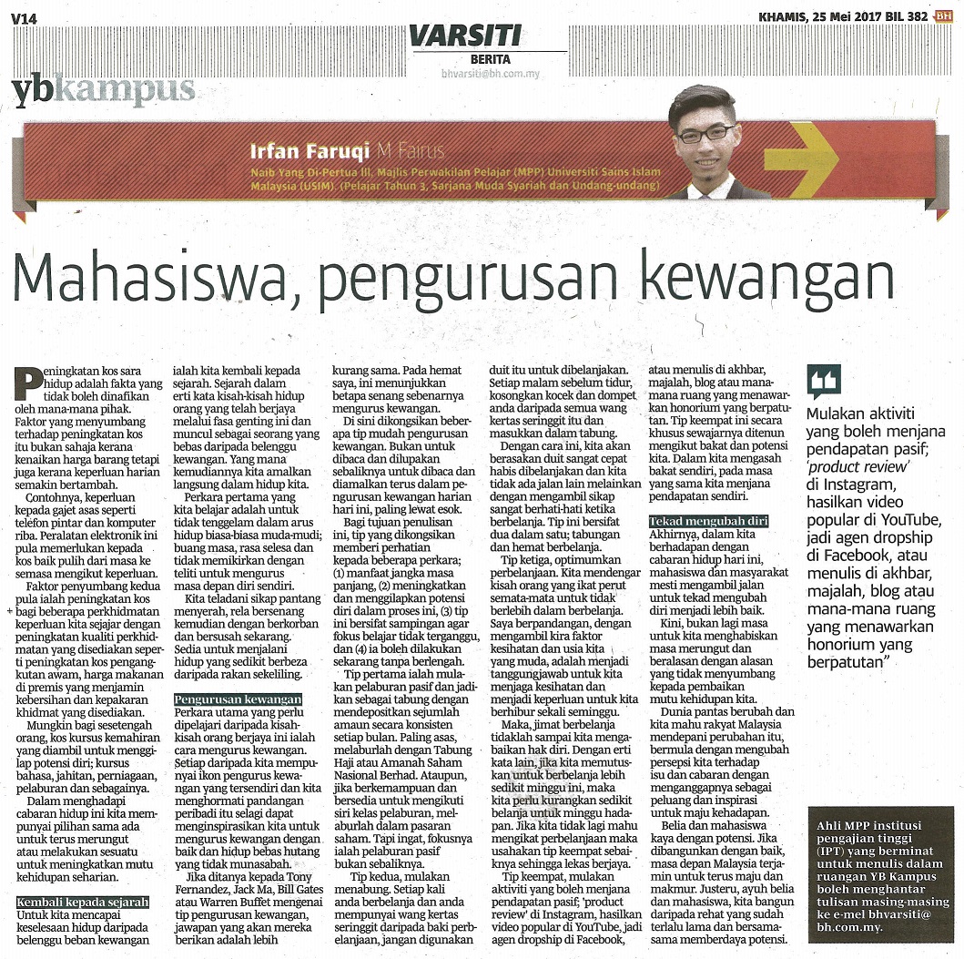 BERITA HARIAN - MAHASISWA, PENGURUSAN KEWANGAN, 25 MEI 2017, MS V14 (VARSITI).jpg