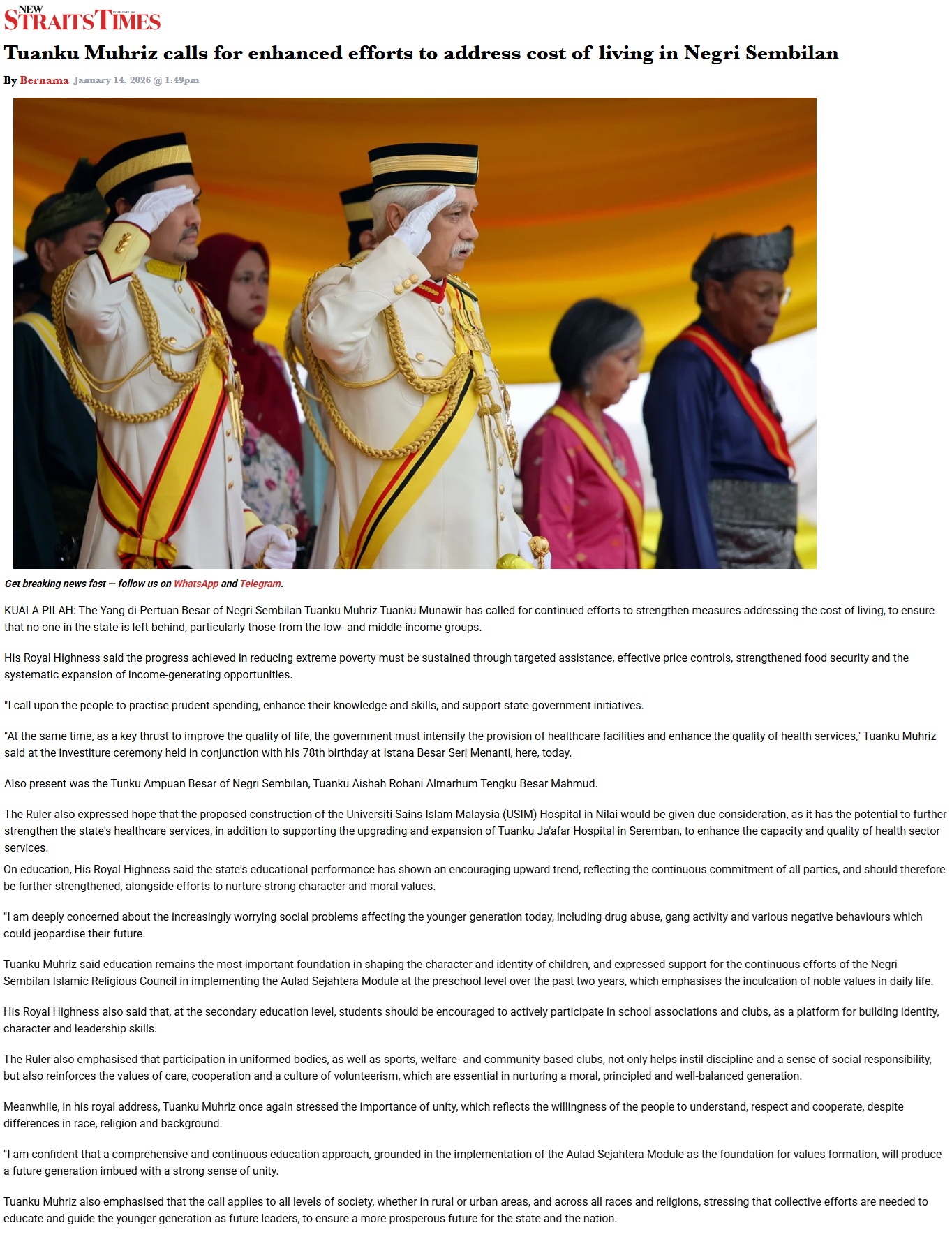 TUANKU MUHRIZ CALLS FOR ENHANCED EFFORTS TO ADDRESS COST OF LIVING IN NEGERI SEMBILAN