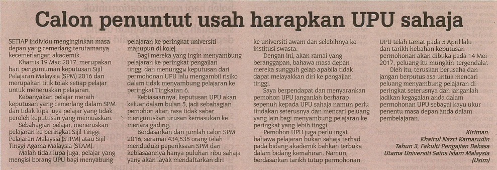 Calon Penuntut Usah Harapkan UPU Sahaja
