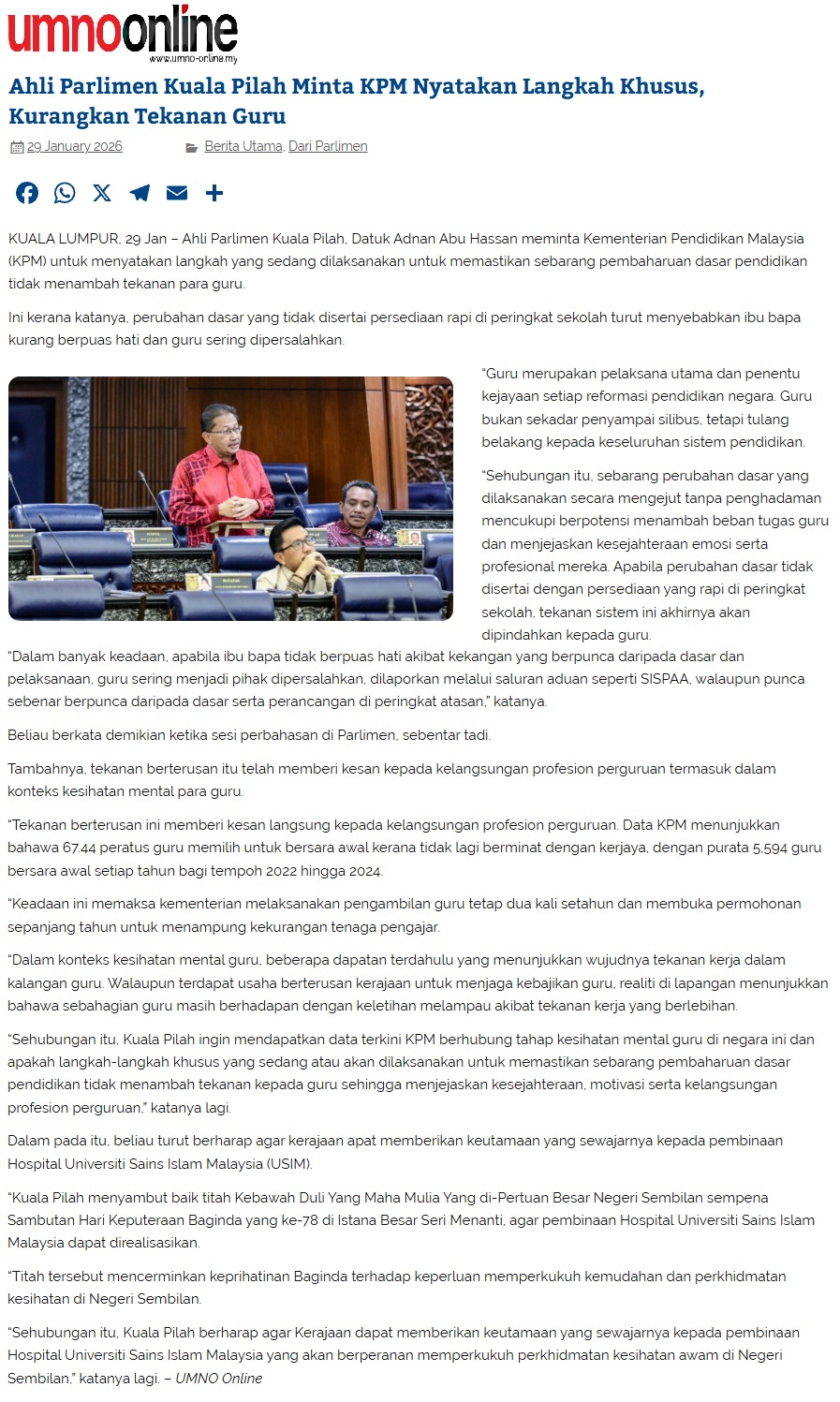 AHLI PARLIMEN KUALA PILAH MINTA KPM NYATAKAN LANGKAH KHUSUS, KURANGKAN TEKANAN GURU
