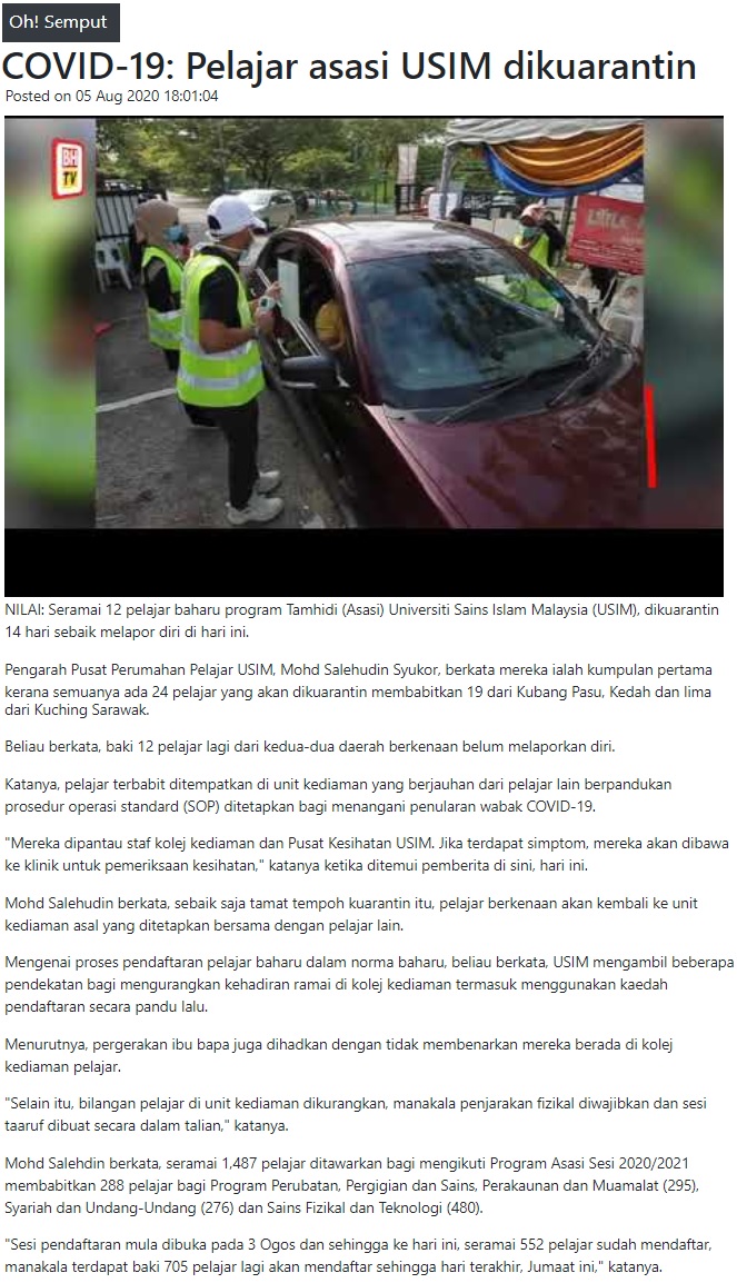 Pelajar Asasi USIM Dikuarantin