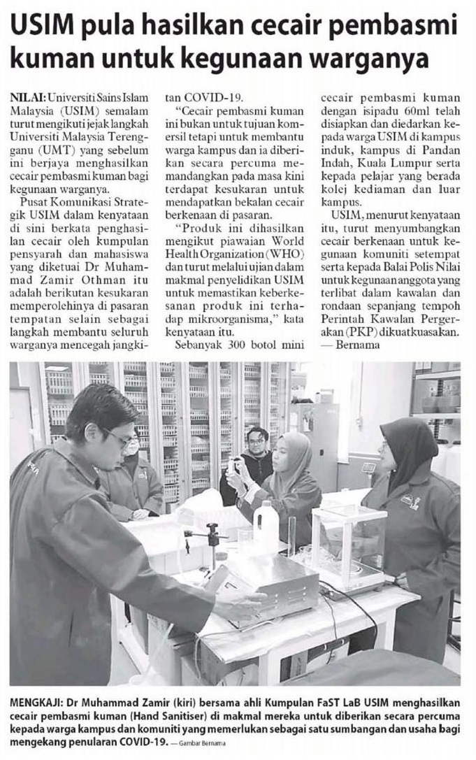 USIM Hasilkan Cecair Pembasmi Kuman Untuk Kegunaan Warganya