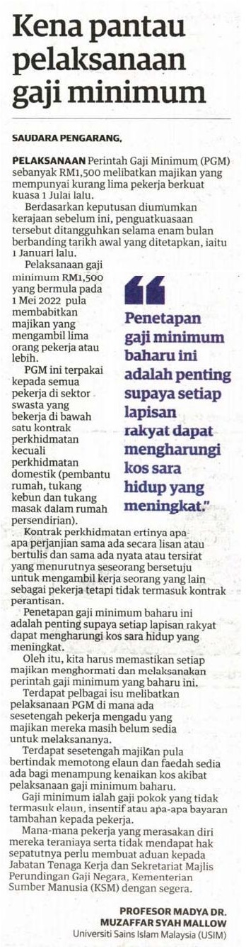 Kena pantau perlaksanaan gaji minimum