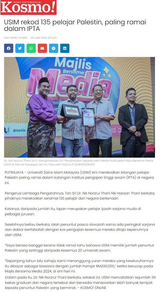 USIM rekod 135 pelajar Palestin, paling ramai dalam IPTA