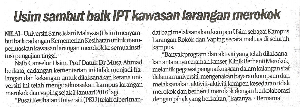 USIM Sambut Baik IPT Kawasan Larangan Merokok
