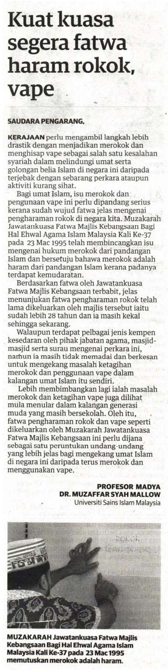 Kuat kuasa segera fatwa haram rokok, vape