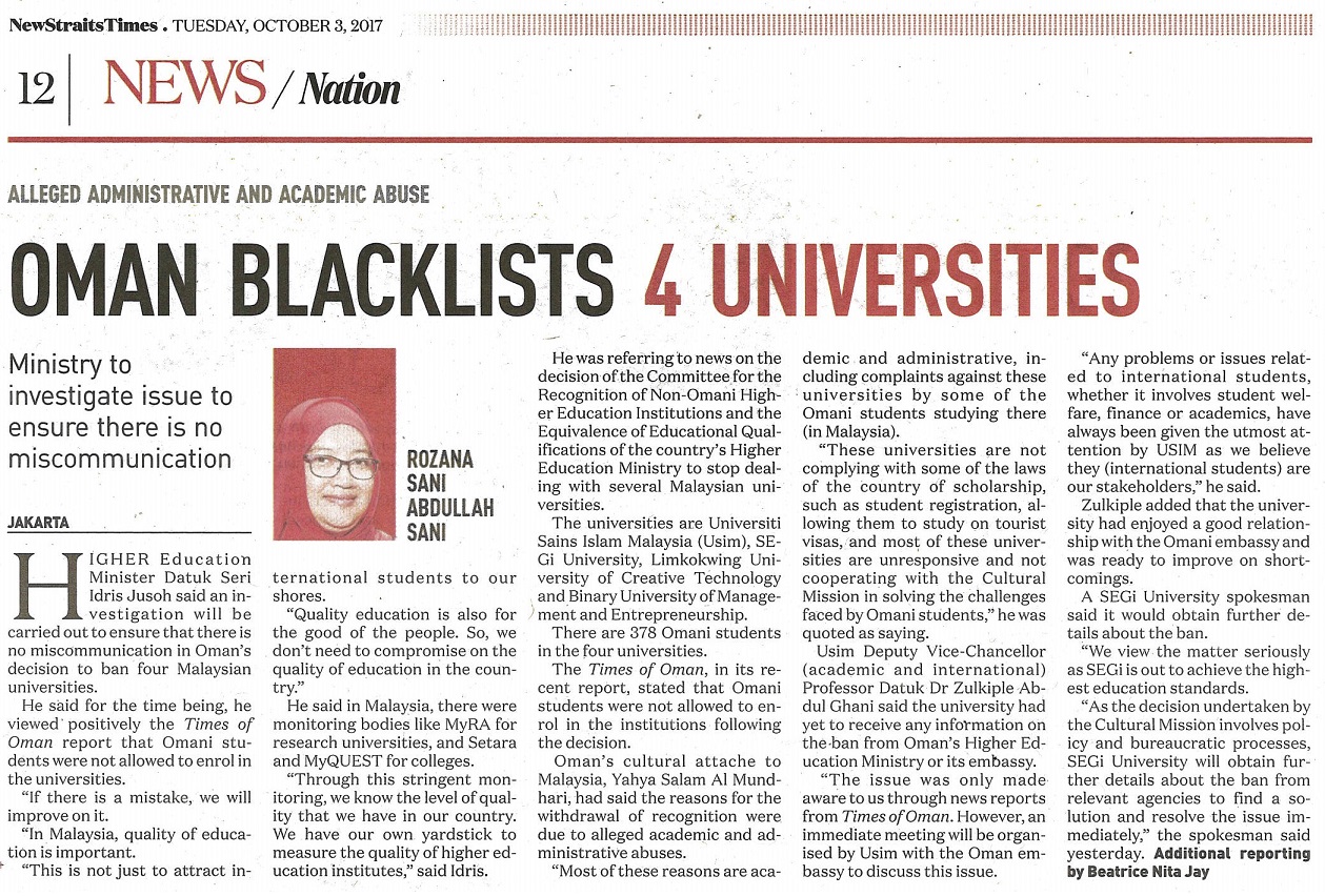 NEW STRAITS TIMES - OMAN BLACKLISTS 4 UNIVERSITIES, 3 OKTOBER 2017, MS 12.jpg