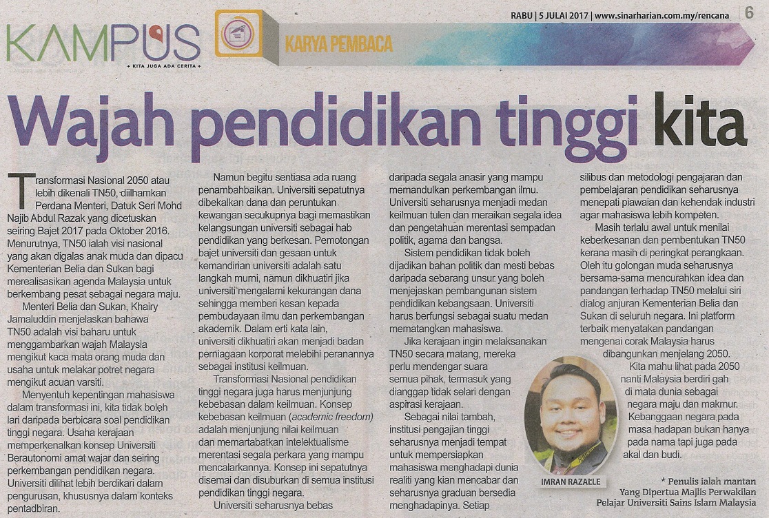 SINAR HARIAN - WAJAH PENDIDIKAN TINGGI KITA, 5 JULAI 2017, MS 6 (KAMPUS).jpg
