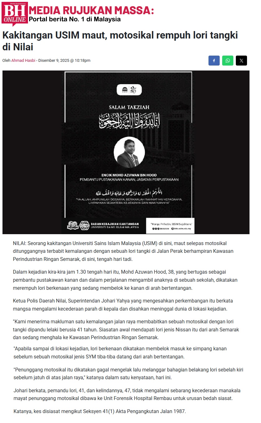 KAKITANGAN USIM MAUT, MOTOSIKAL REMPUH LORI TANGKI DI NILAI