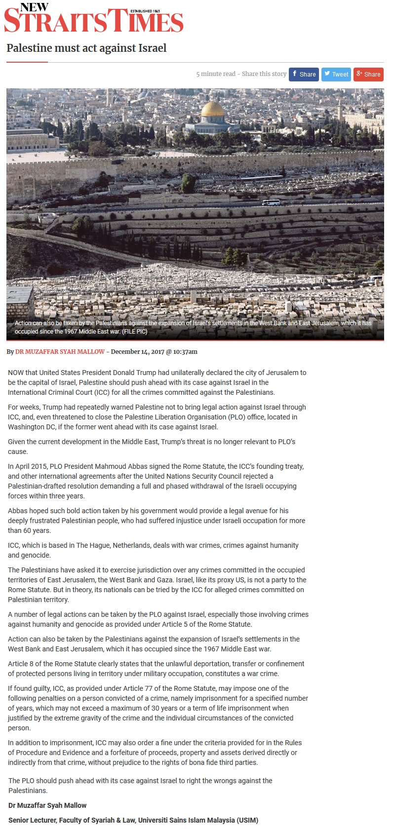 NEW STRAITS TIMES ONLINE - PALESTINE MUST ACT AGAINST ISRAEL, 14 DISEMBER 2017, MS 6.jpg
