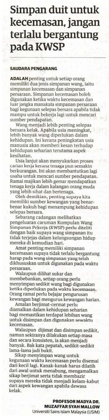 Simpan duit untuk kecemasan, jangan bergantung pada KWSP