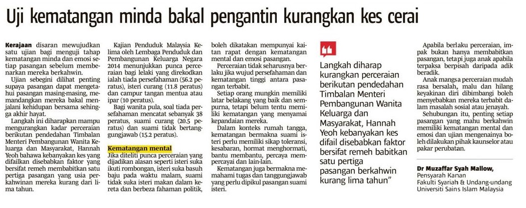 Uji Kematangan Minda Bakal Pengantin Kurangkan Kes Cerai