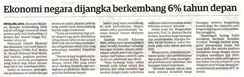 EKONOMI NEGARA DIJANGKA BERKEMBANG 6% TAHUN DEPAN