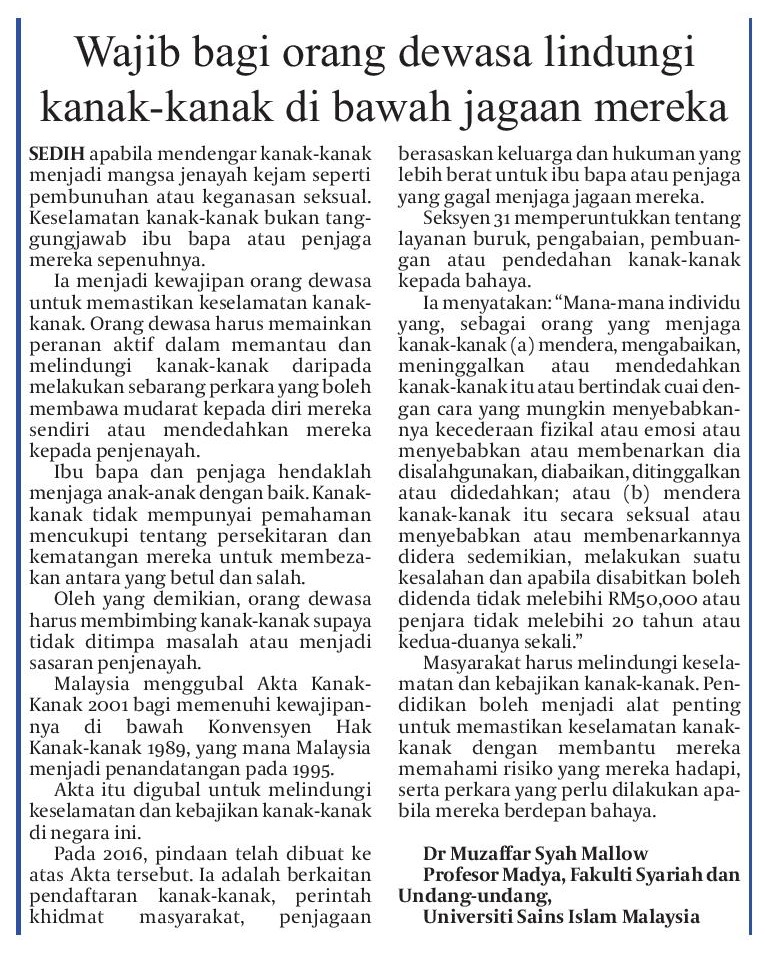 Wajib bagi orang dewasa lindungi kanak-kanak di bawah jagaan mereka