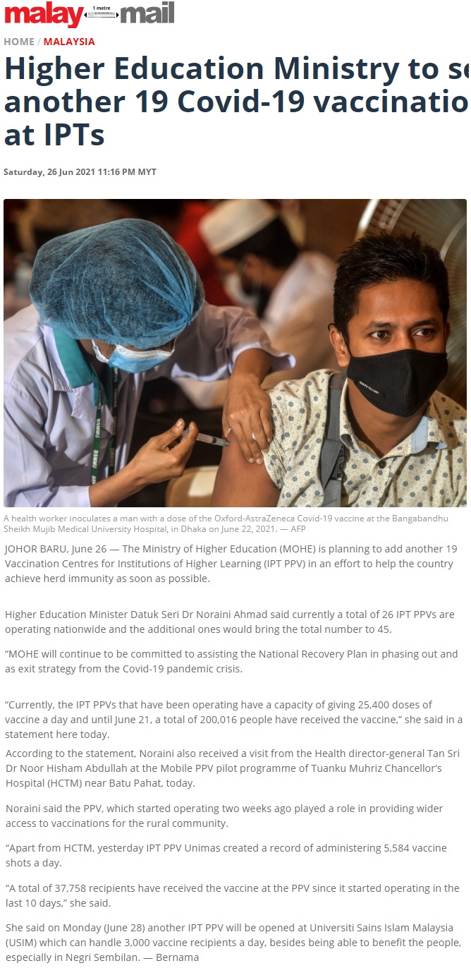 Higher Education Ministry To Set Up Another 19 Covid Vaccination