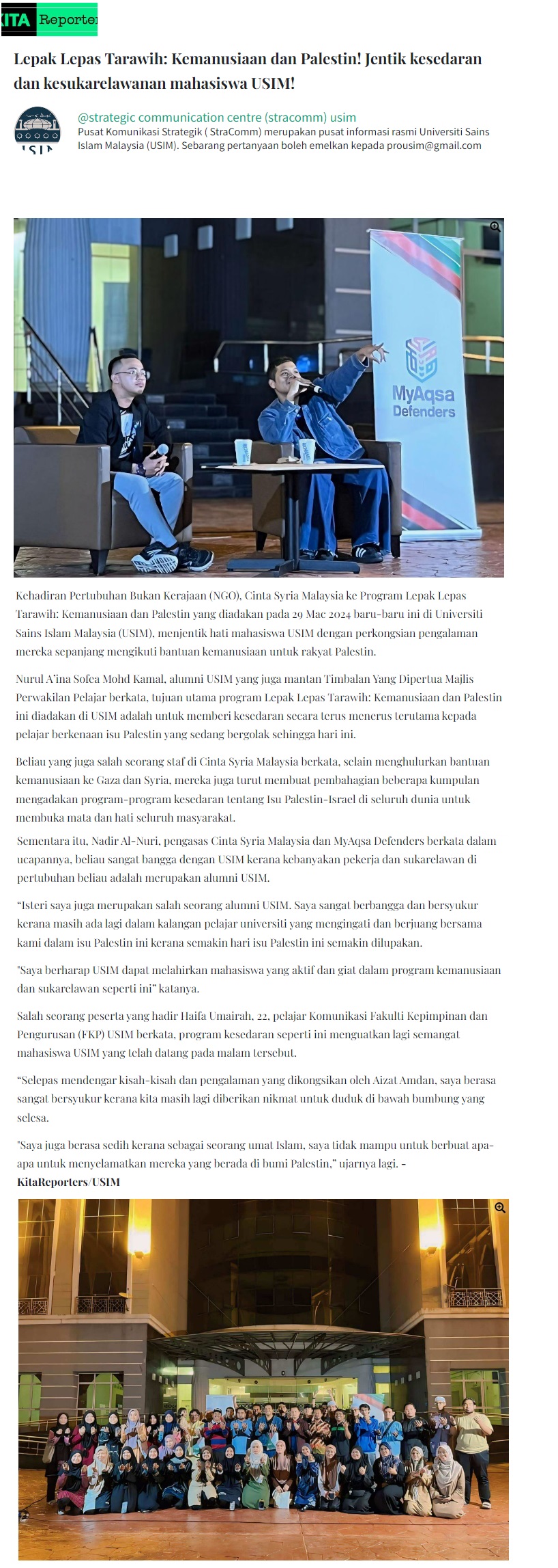Lepak lepas terawih: kemanusiaan dan Palestin! Jentik kesedaran dan kesukarelawanan mahasiswa USIM