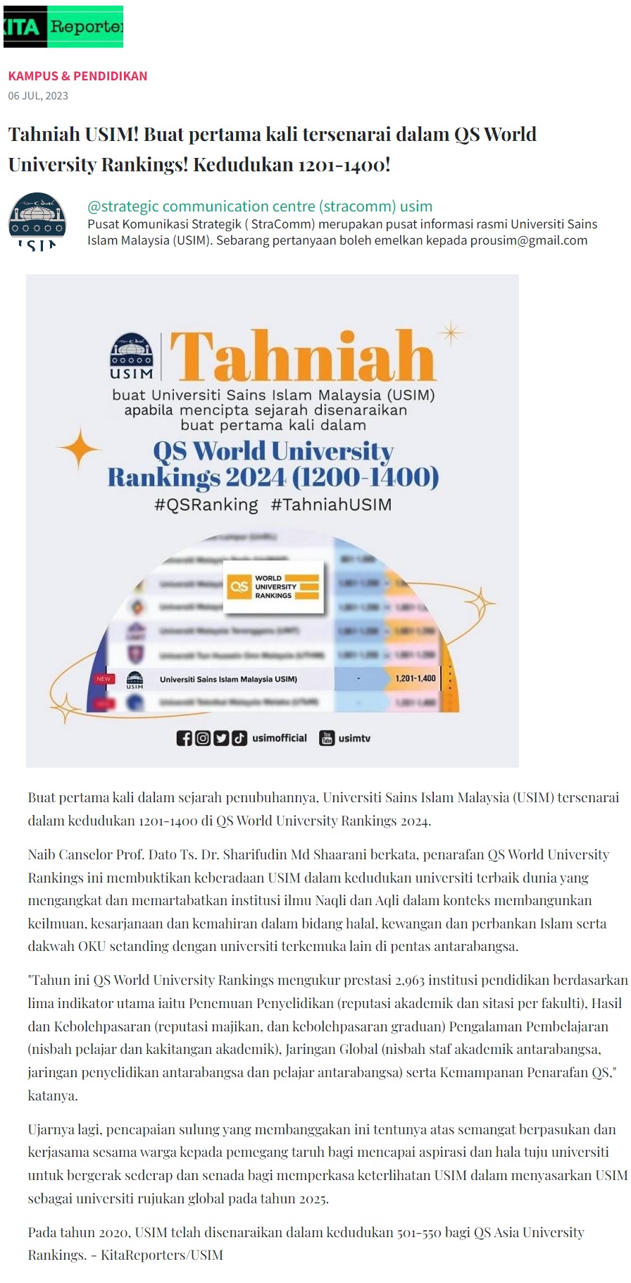Tahniah USIM! buat pertama kali tersenarai dalam QS World University Rankings! kedudukan 1201-1400