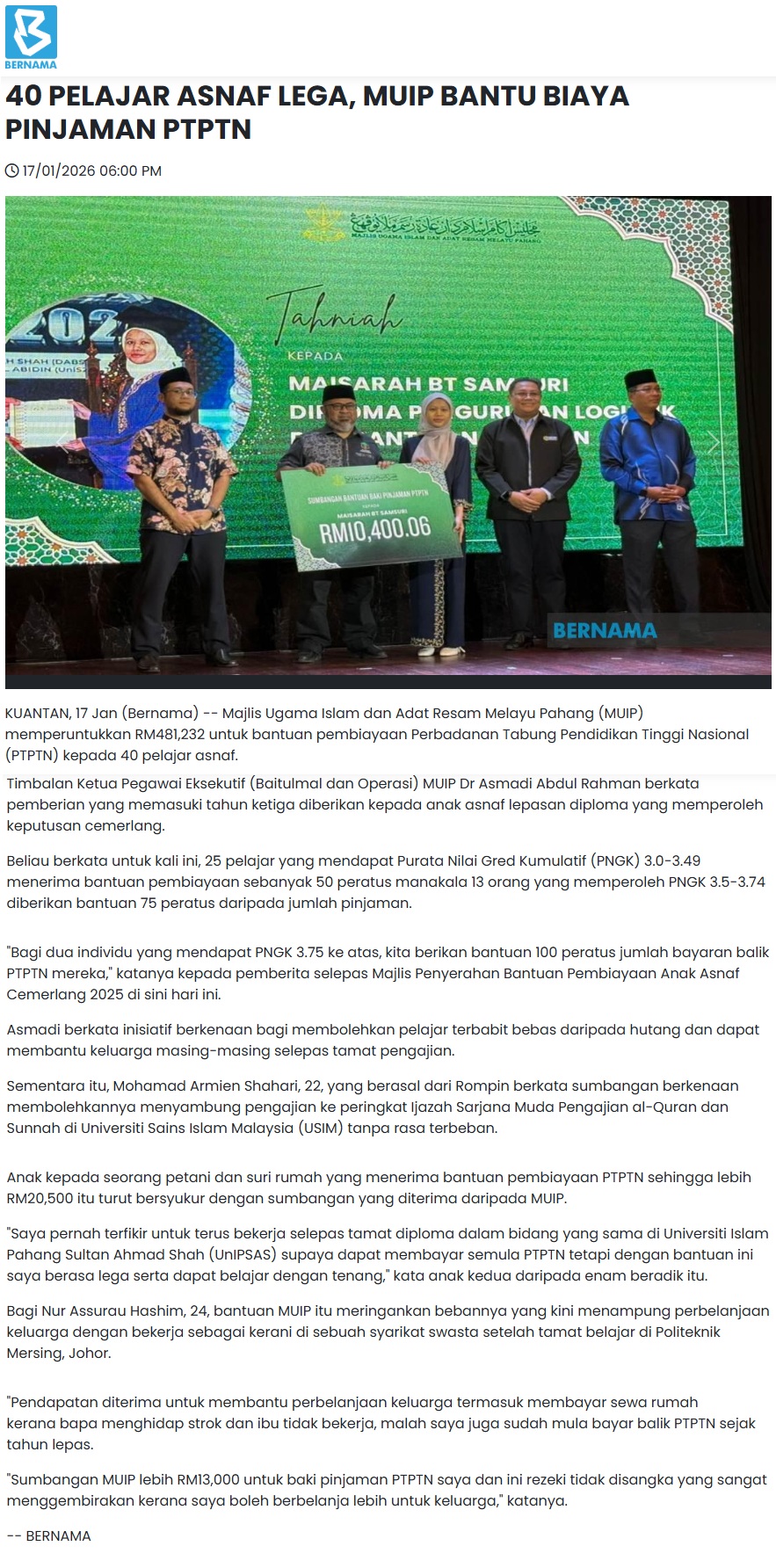 40 PELAJAR ASNAF LEGA, MUIP BANTU BIAYA PINJAMAN PTPTN