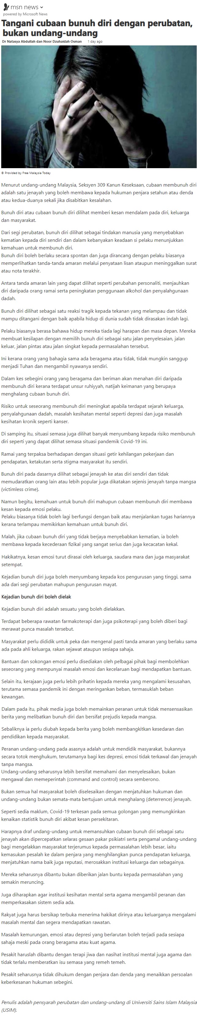 Tangani Bunuh Diri Dengan Rawatan, Bukan Hukuman