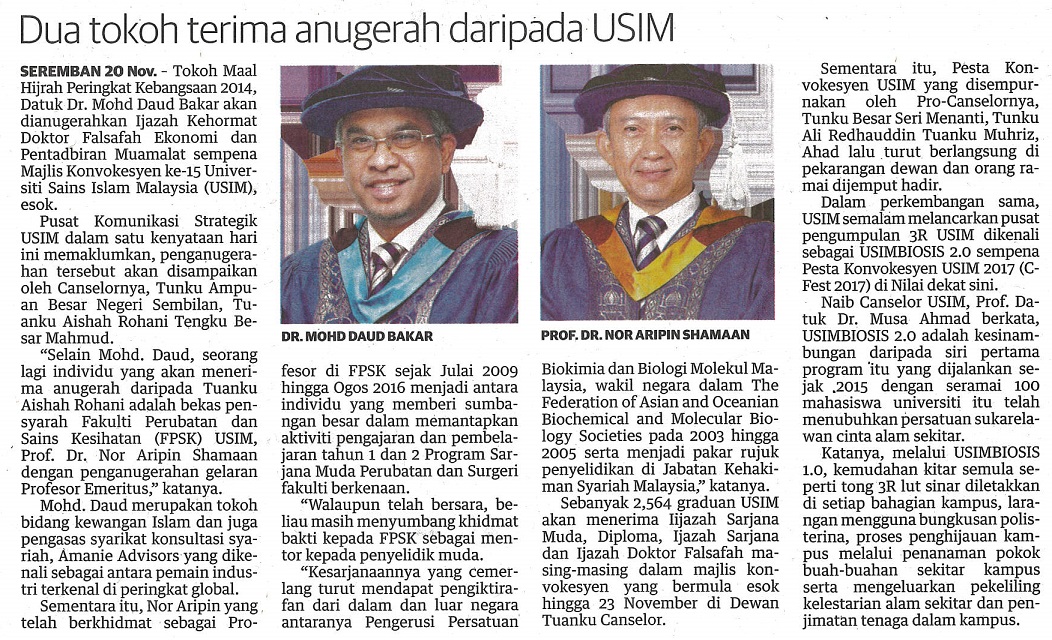 UTUSAN MALAYSIA - DUA TOKOH TERIMA ANUGERAH DARIPADA USIM, 21 NOVEMBER 2017, MS 8.jpg