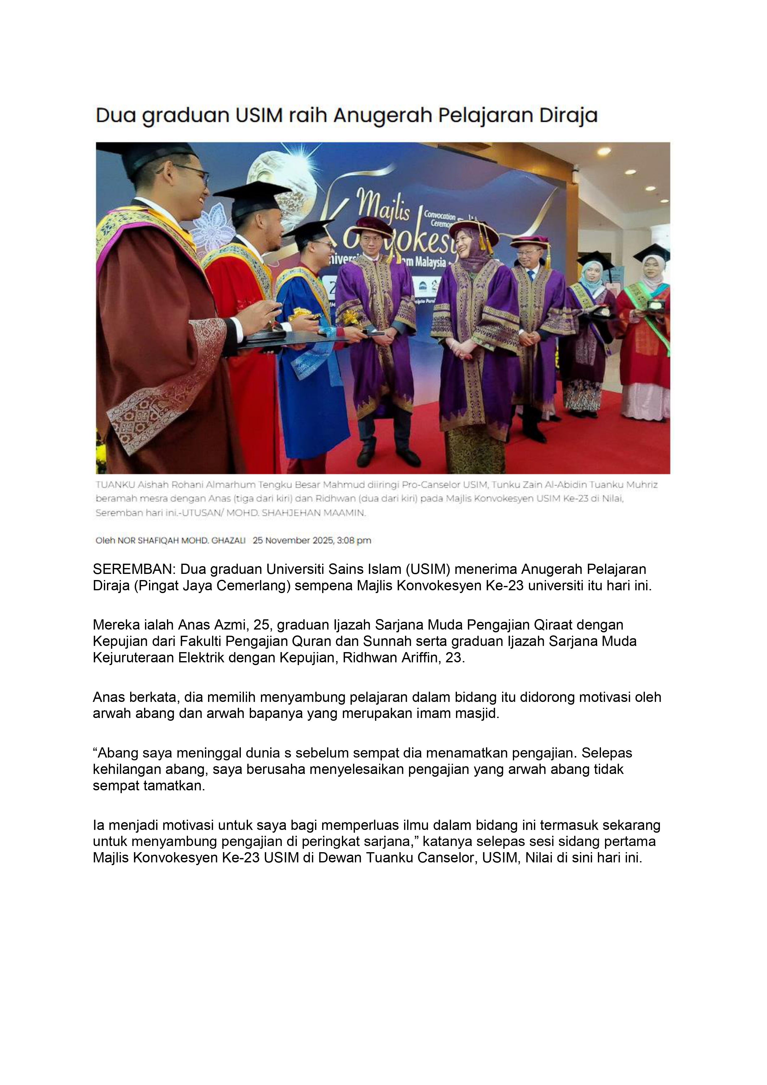 Dua graduan USIM raih Anugerah Pelajaran Diraja