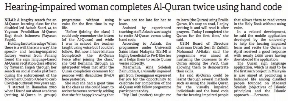Hearing -impaired woman completes Al-Quran twice using hand code