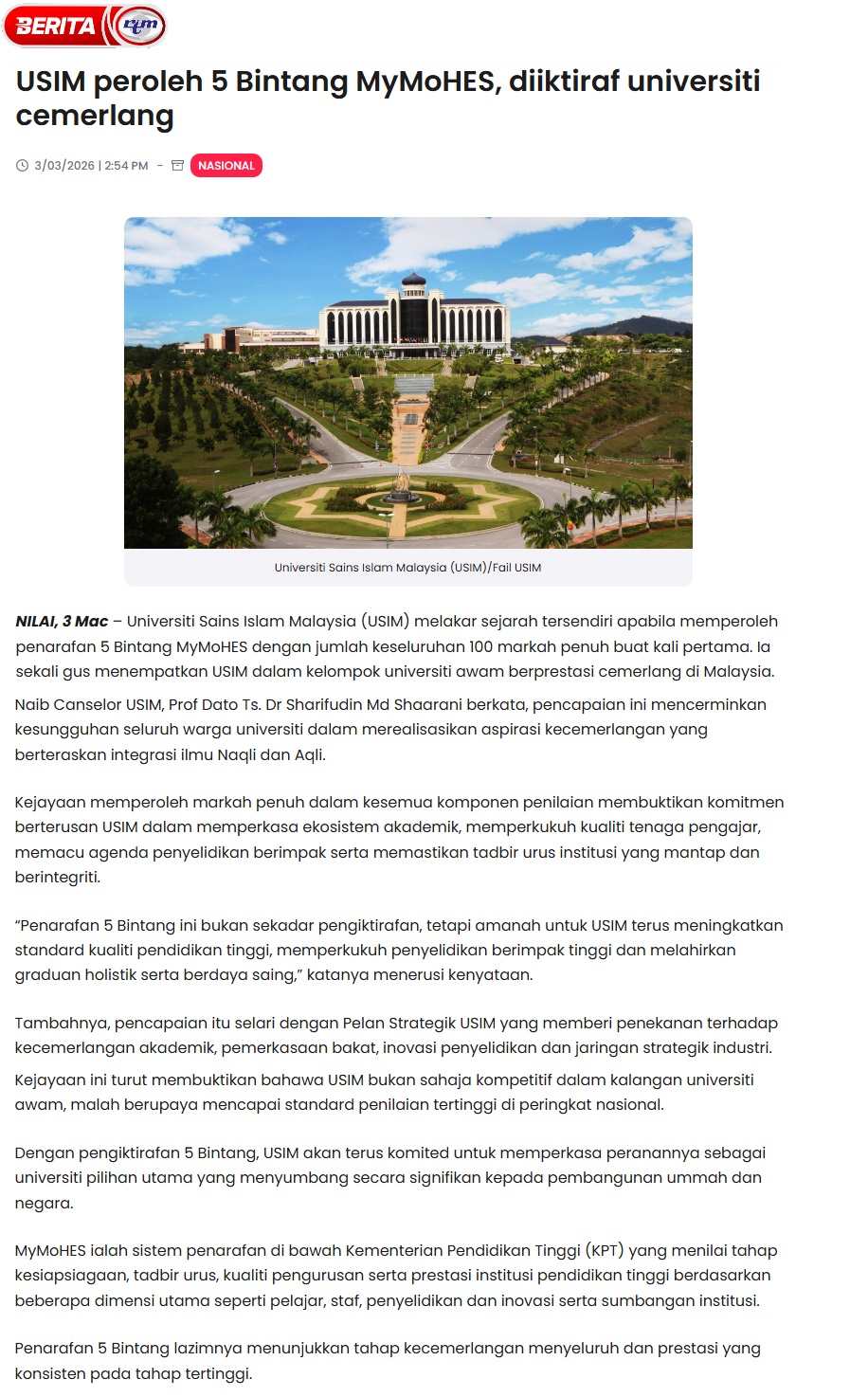 USIM PEROLEH 5 BINTANG MYMOHES, DIIKTIRAF UNIVERSITI CEMERLANG