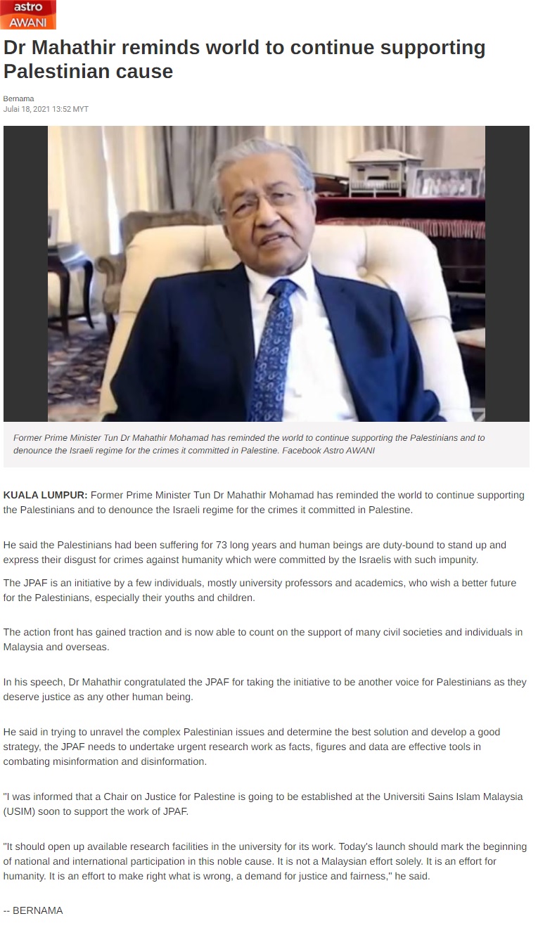 Dr Mahathir Reminds World To Continue Supporting Palestinian Cause