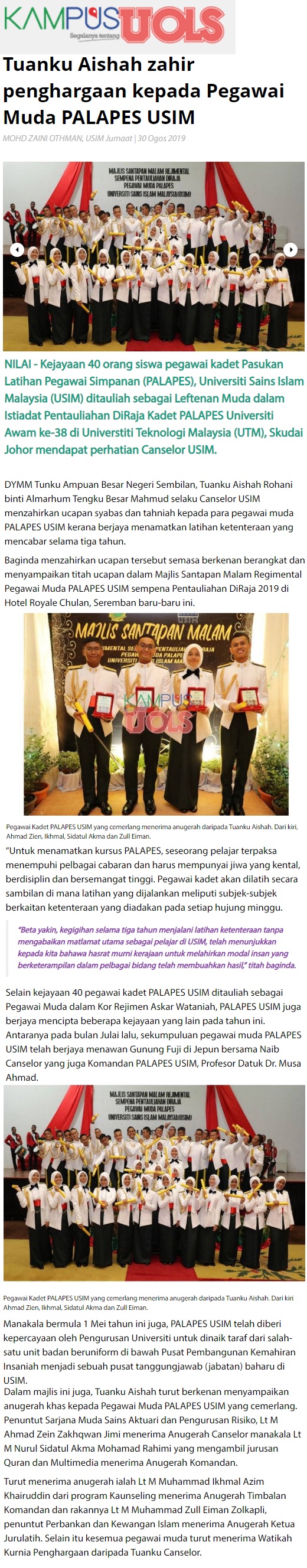 Tuanku Aisyah Zahir Penghargaan Kepada Pegawai Muda Palapes USIM