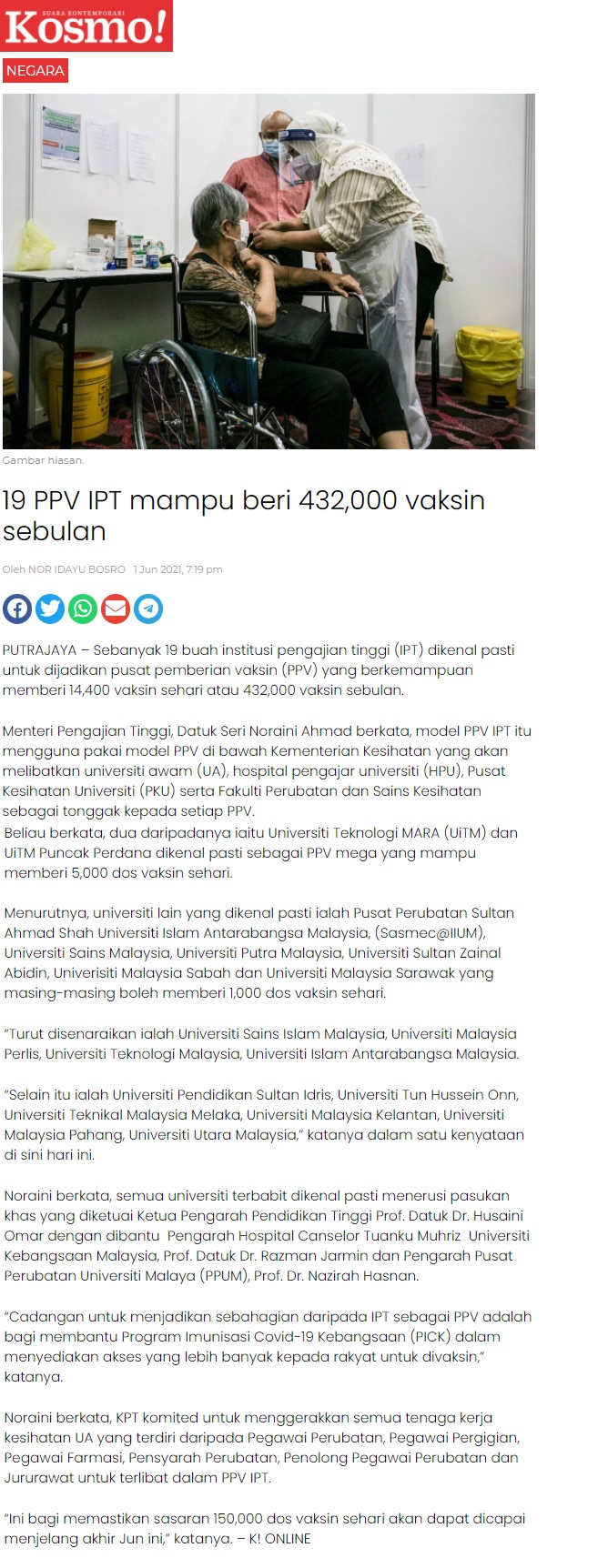 19 PPV IPT Mampu Beri 432,000 Vaksin Sebulan