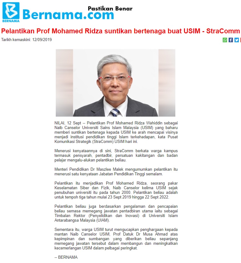 Pelantikan Prof Mohamed Ridza Suntikan Bertenaga Buat USIM
