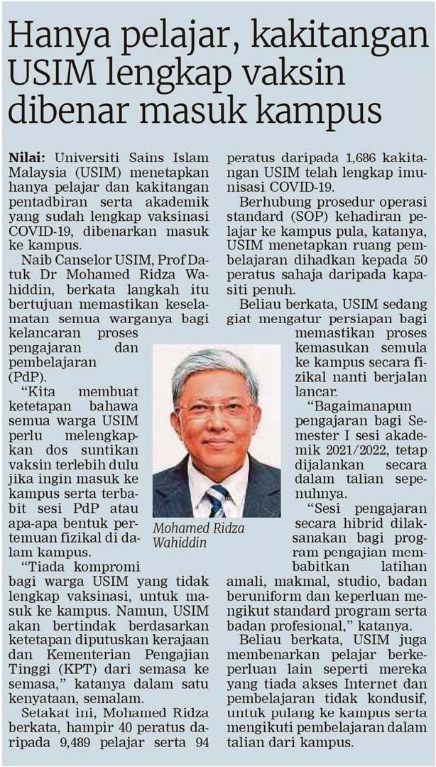 Hanya Pelajar, Kakitangan Lengkap Vaksin Dibenar Masuk Kampus
