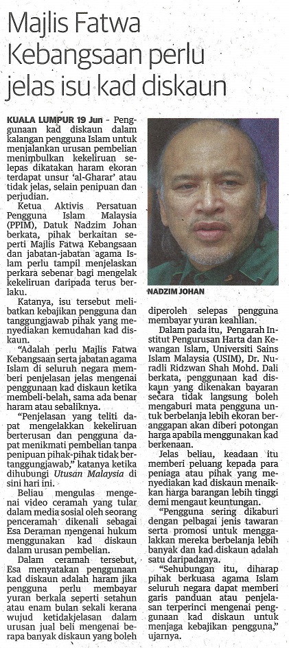 UTUSAN MALAYSIA - MAJLIS FATWA KEBANGSAAN PERLU JELAS ISU KAD DISKAUN, 20 JUN 2017, MS 33.jpg