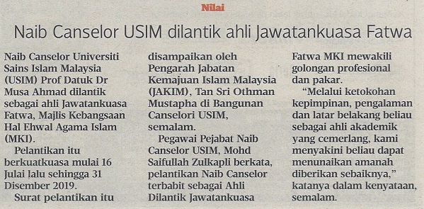 HARIAN METRO - NAIB CANSELOR USIM DILANTIK AHLI JAWATANKUASA FATWA, 26 OGOS 2017, MS 52.jpg