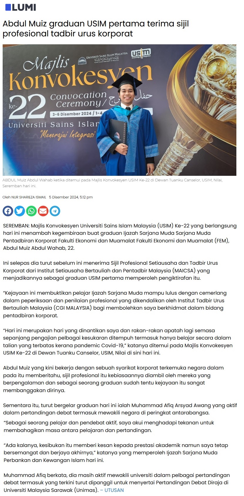 Abdul Muiz graduan USIM pertama terima sijil profesional tadbir urus korporat