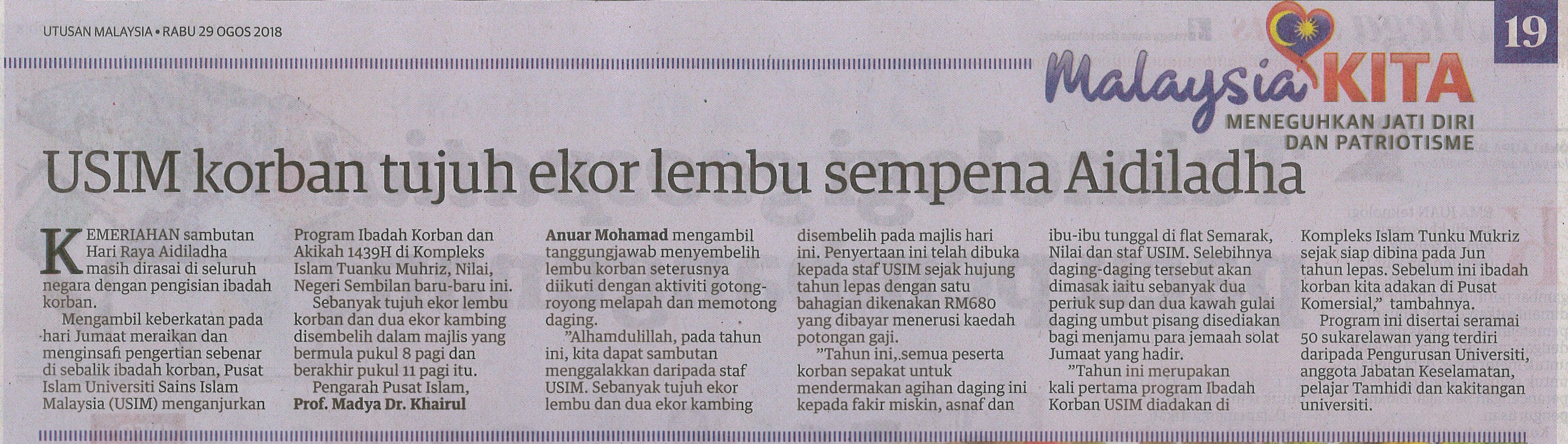UTUSAN MALAYSIA 29 OGOS 2018 MS 19 USIM KORBAN TUJUH EKOR LEMBU SEMPENA AIDILADHA.jpg