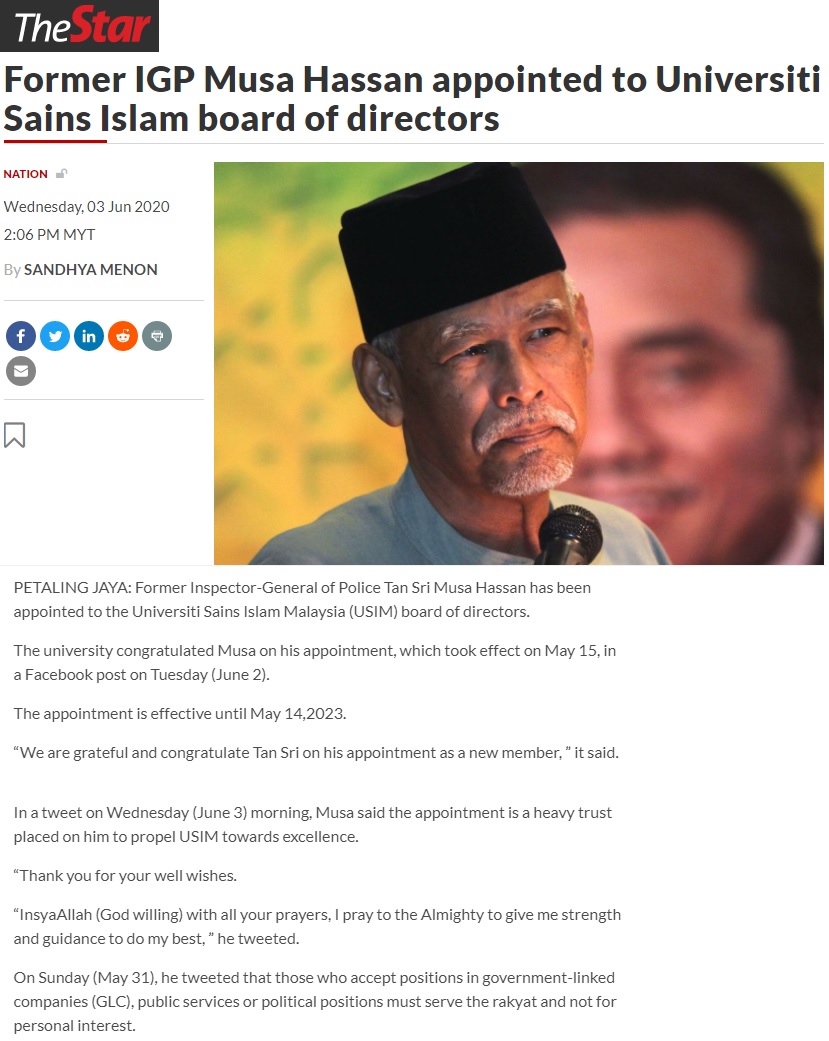 Former IGP Musa Hassan Appointed To Universiti Sains Islam Board Of Director
