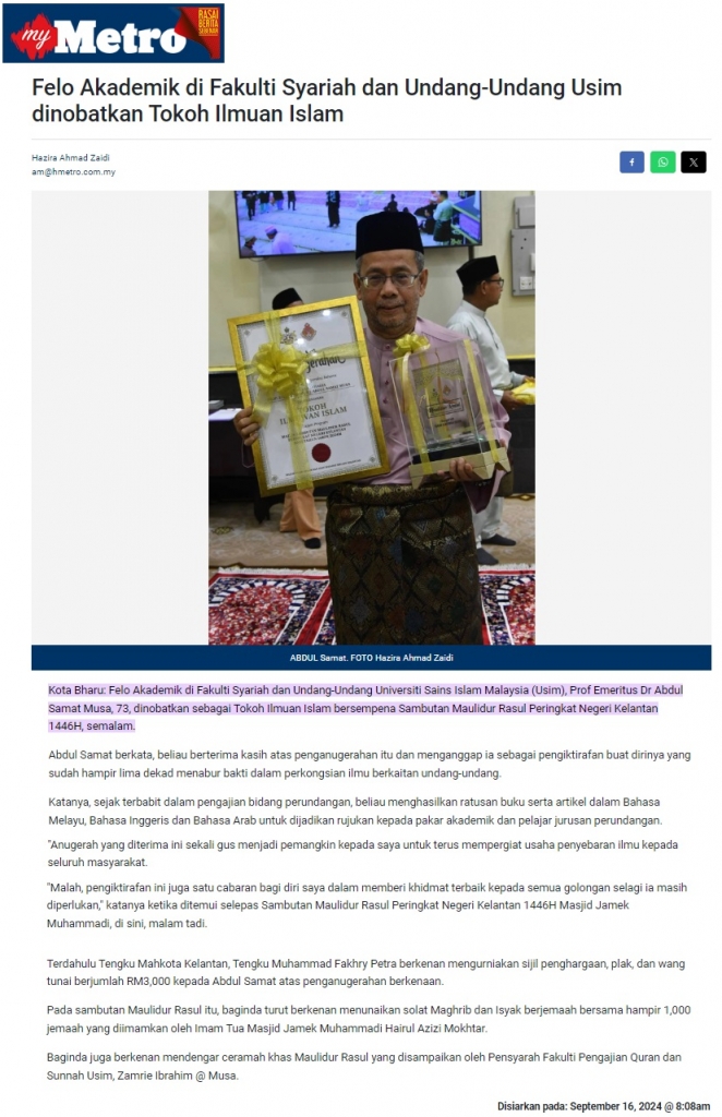 Felo akademik di Fakulti Syariah dan Undang-Undang USIM dinobatkan tokoh ilmuan Islam